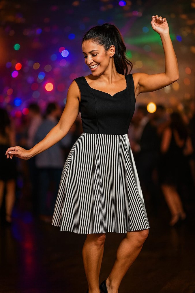 Siyah üst kısmı ve açık renk çizgili, pilili midi etekli, straplez ve vücuda oturan kokteyl elbisesi. Parti için uygun.