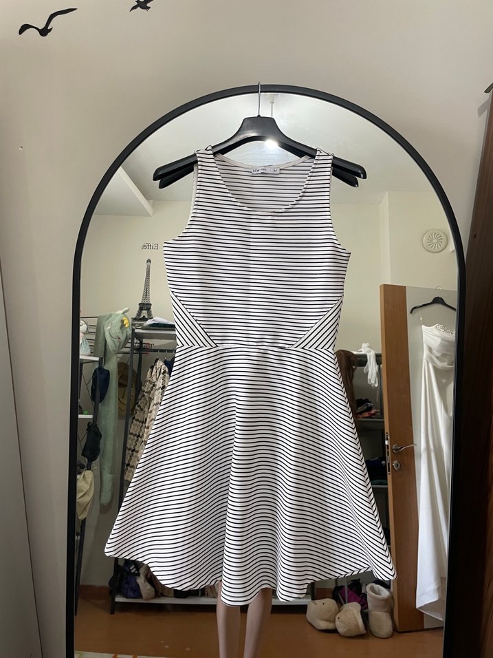 Kolsuz, çizgili ve pilili detaylara sahip midi uzunlukta, vücuda oturan elbise. Kayık yaka ve yumuşak sentetik kumaştan, günlük kullanıma uygun. ️marka temsili❗️‼️