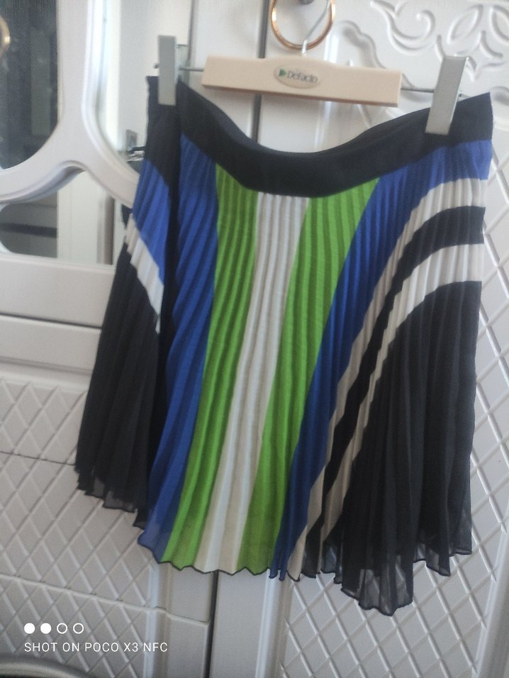 Çizgili, pilili mini hamile eteği, bol kesimli ve koyu renklerde mavi, yeşil, beyaz ile siyah çizgiler içerir. Yumuşak sentetik kumaştan üretilmiştir ve günlük kullanıma uygundur.