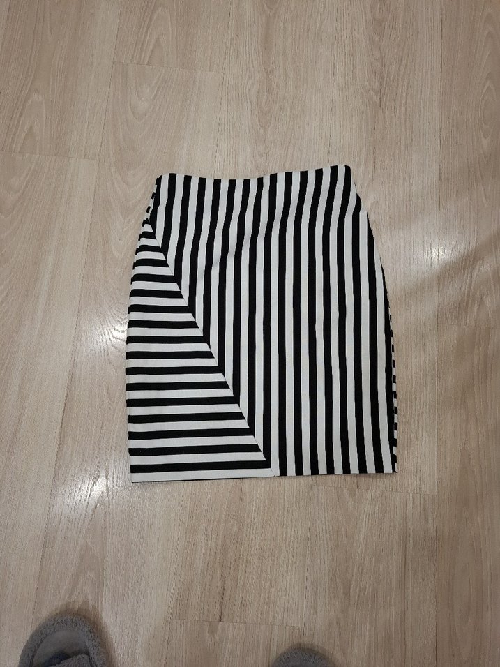 Çizgili desenli, pilili siyah uzun hamile eteği. Düzgün kesim, yumuşak sentetik kumaştan, günlük kullanıma uygun.