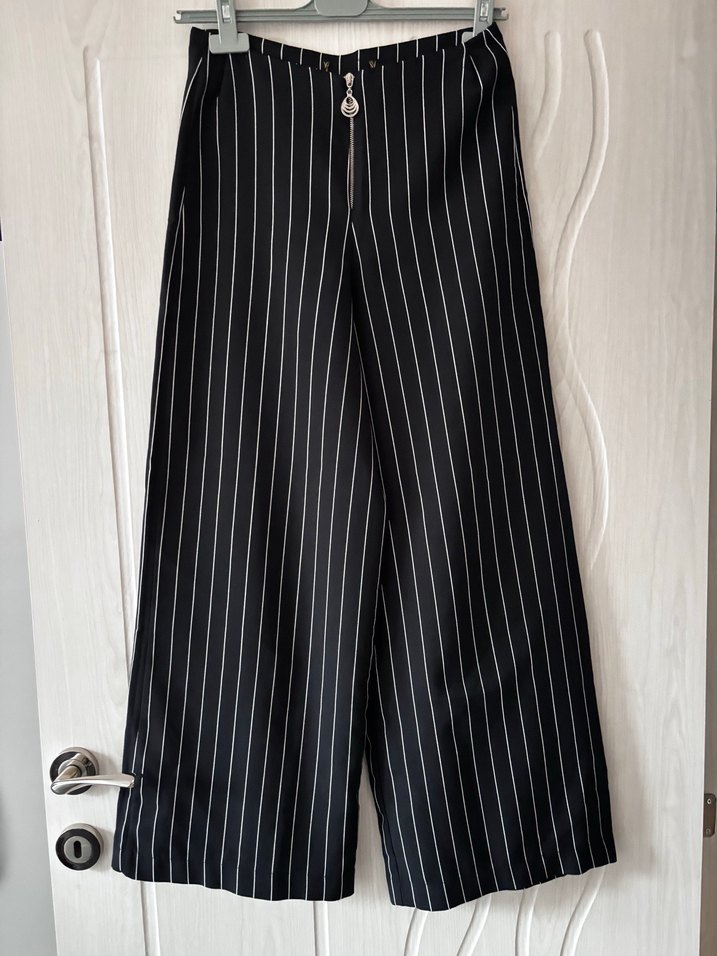 Siyah renkte, beyaz çizgili, pilili ve normal kesim kumaş pantolon. Önünde fermuar var. Kalıbı çok güzel, kumaşı kaliteli İki kez giydim ve sonraki mevsim kilo aldım :(