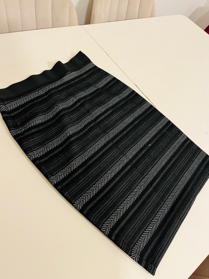 Siyah renkte, çizgili desenli ve pilili midi kalem etek, rahat sentetik kumaş ve normal kesimle günlük sokak stiline uygun.