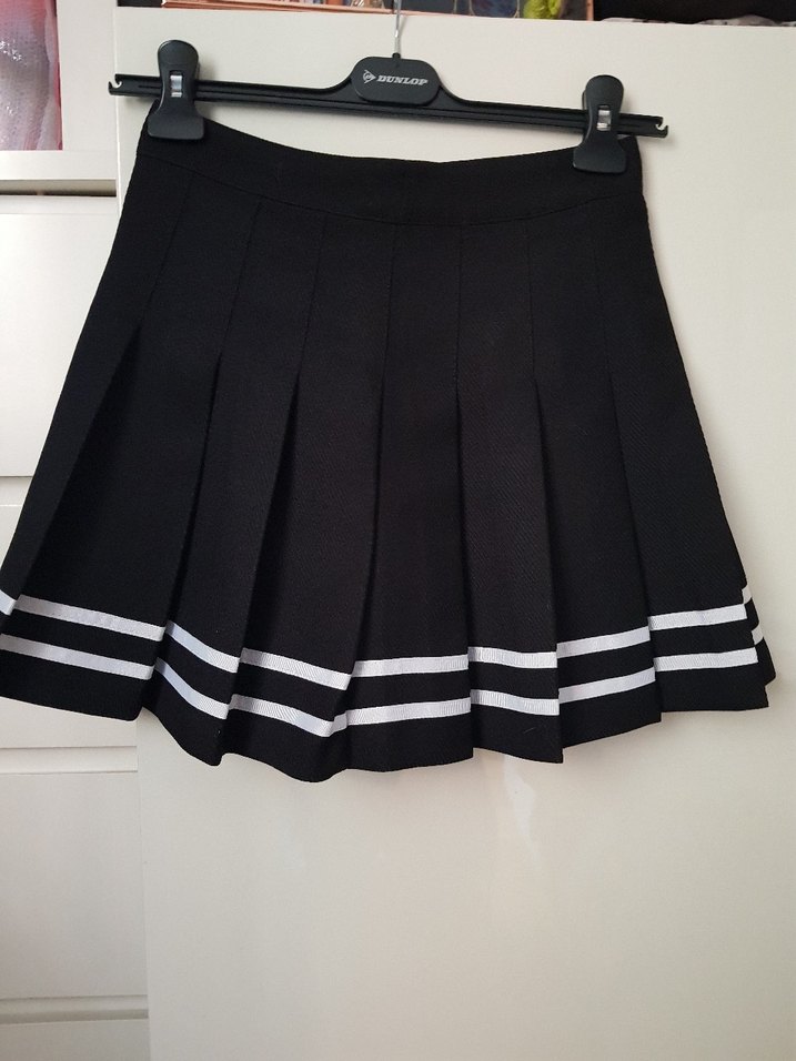 Sentetik kalın kumaştan yapılmış, pilili ve beyaz çizgili desenli siyah mini etek. Trendy casual tarzı ve günlük kullanım için uygundur. #h&mpililisiyahetek #pilelisiyahetek