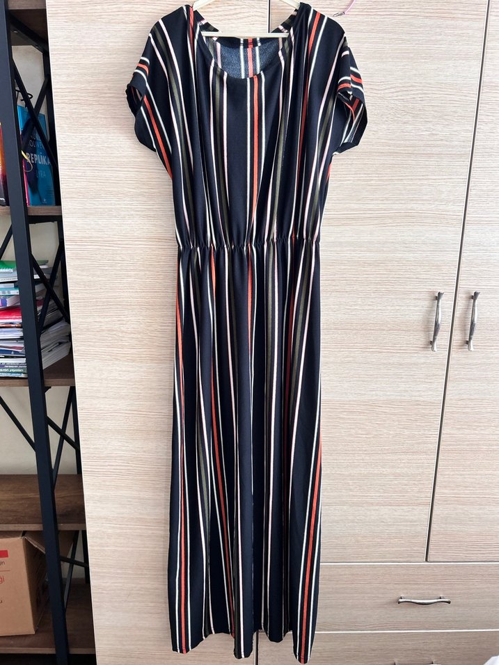 Uzun, pilili ve bol kesim kadın elbisesi, tekne yaka ve çizgili desenlidir. Sentetik kumaştan, günlük rahat stil için uygundur.