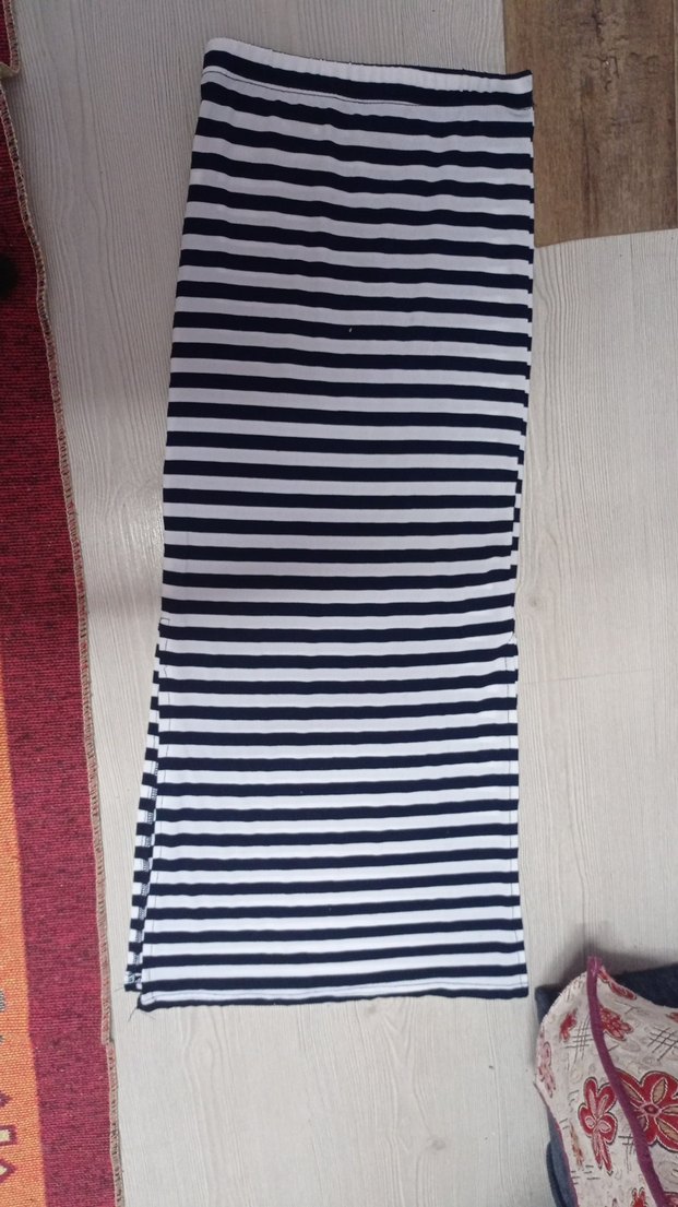 Gri ve beyaz çizgili, pilili ve fitted kesim uzun kadın eteği. Düzgün sentetik kumaştan üretilmiştir, minimalist sokak stili için uygundur.