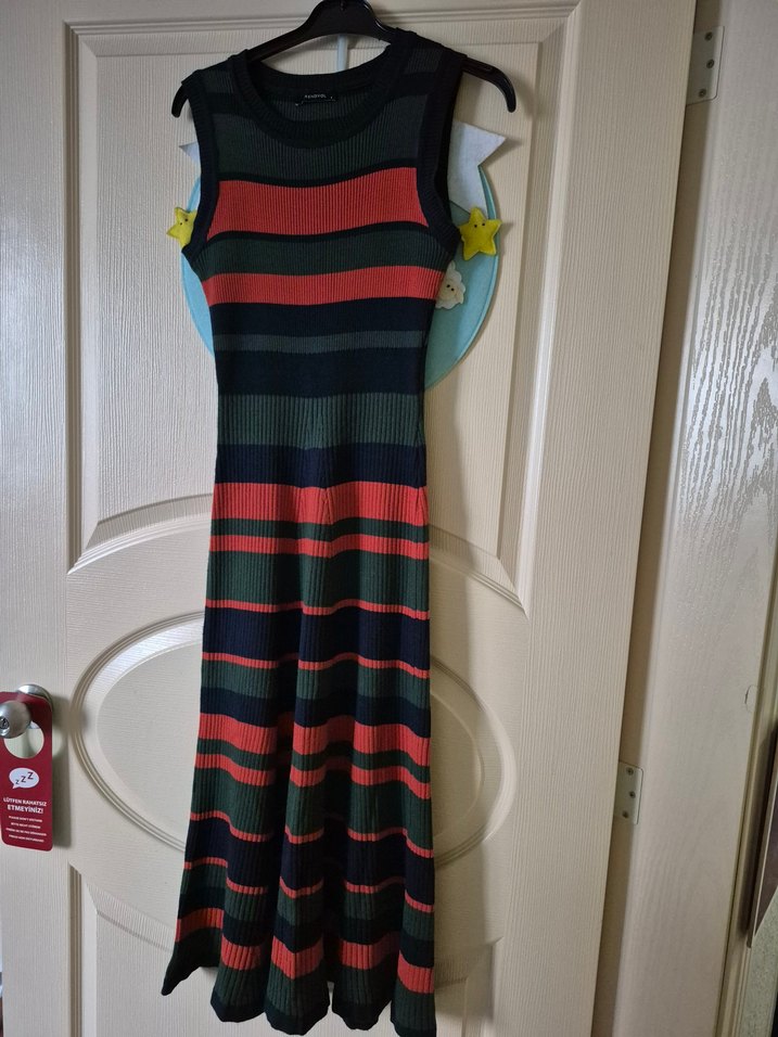 Kolsuz, uzun ve vücuda oturan triko elbise, pilili detaylar ve yuvarlak yaka ile. Koyu çok renkli çizgili deseni sokak modasına uygun.