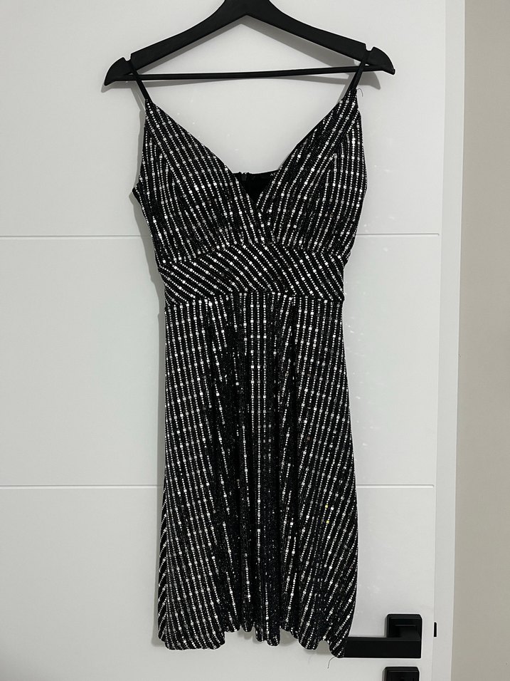 İnce askılı, V yakalı, pilili ve çizgili detaylara sahip siyah, uzun ve vücuda oturan abiye elbise. Parti için şık bir tercih. ✨