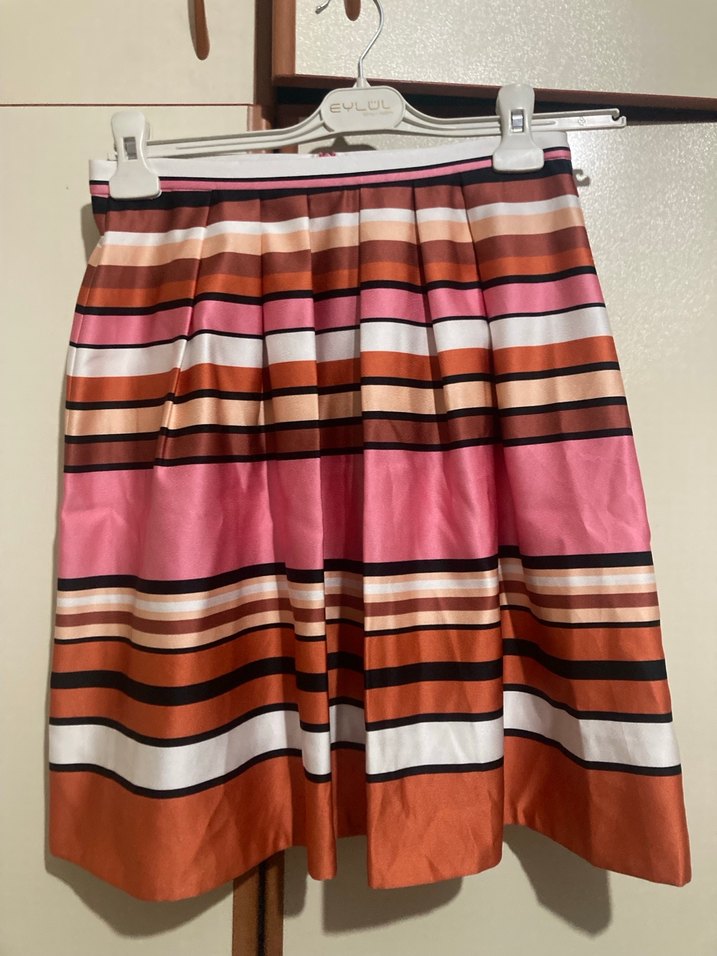 Renkli yatay çizgili, piliseli ve bol kesim hafif etek günlük kullanıma uygundur.