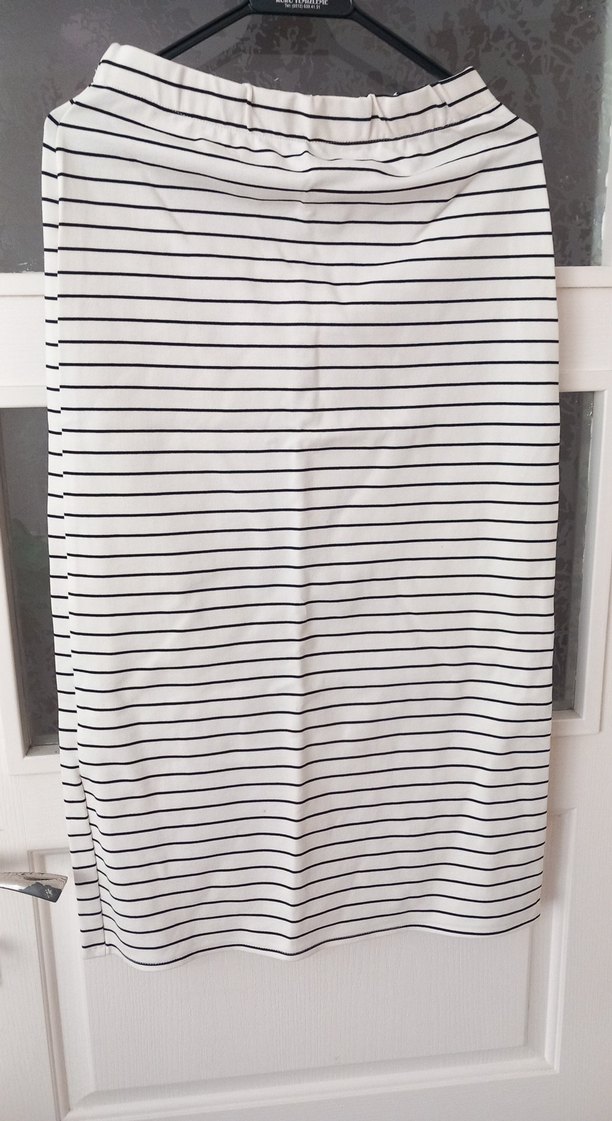 Beyaz ve gri çizgili, piliseli ve vücuda oturan hamile eteği. Yumuşak sentetik kumaştan yapılmış, minimalist ve günlük kullanıma uygun.