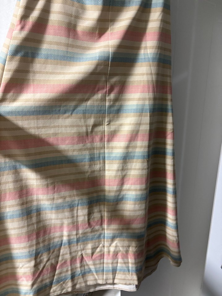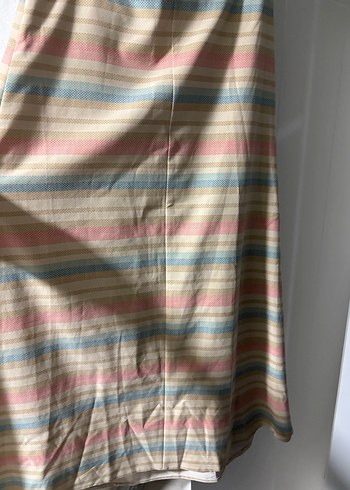 Bu bol kesim midi etek, pastel renkli çizgili deseni ve piliseli detaylarıyla yumuşak sentetik kumaştan yapılmıştır, bohem tarzı yansıtır.