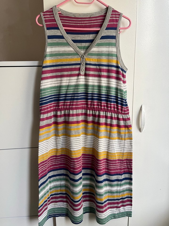 V yaka, kolsuz, pliseli detaylı hamile elbisesi. Renkli yatay çizgiler ve rahat bol kesim. Midi boy, gündelik bohem tarzı.