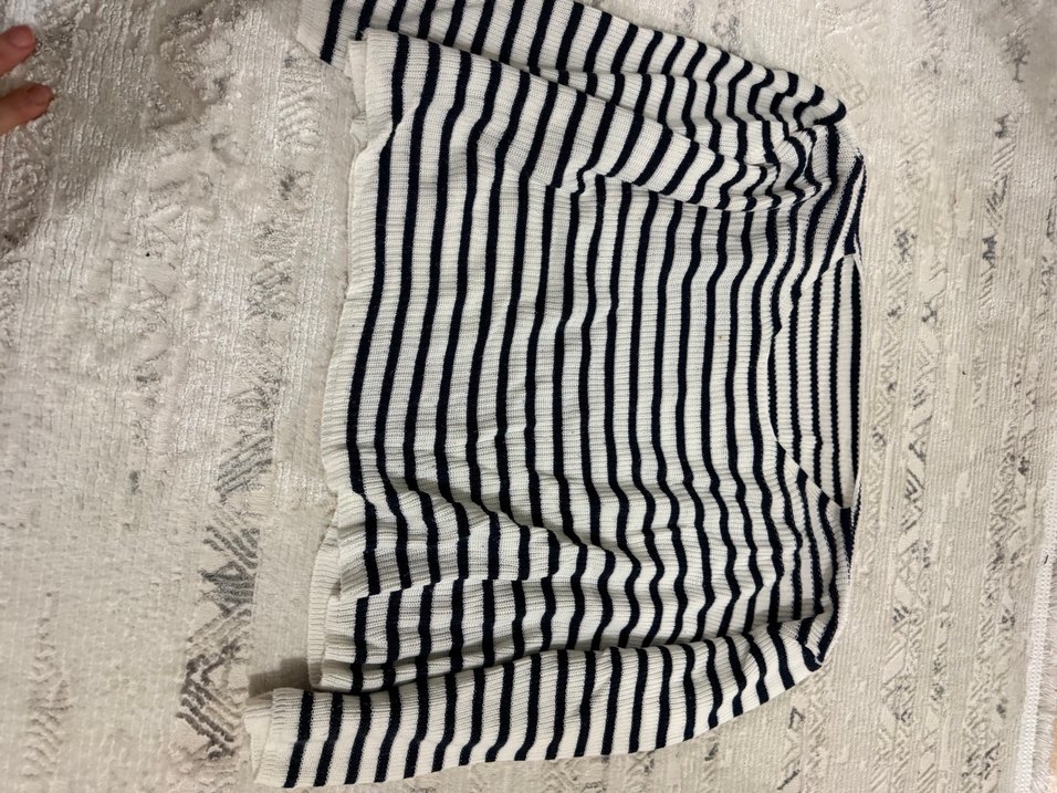 Uzun kollu, kayık yaka ve çizgili desene sahip dolgulu kadın triko. Yumuşak sentetik kumaştan yapılmış, rahat bohem tarzında gri ve beyaz renklerde, günlük kullanıma uygun.