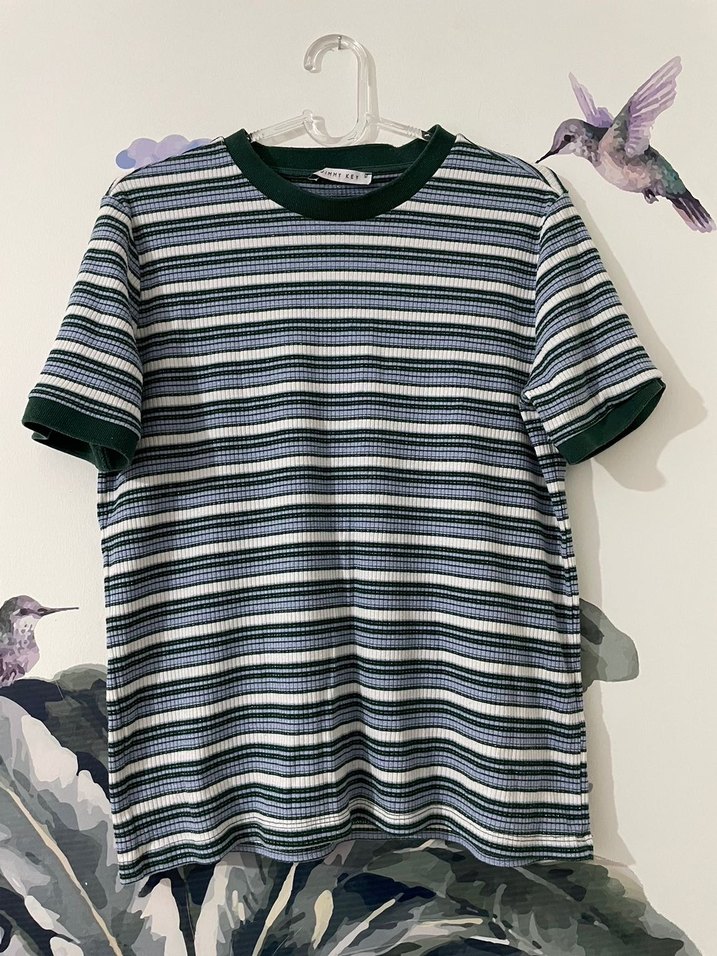 Kısa kollu, yuvarlak yakalı kadın tişörtü, koyu renkli çoklu çizgili ve pliseli tekstil kumaştan. Günlük rahat sokak stili için uygun. Sadece ön tarafında ufak birdelik var