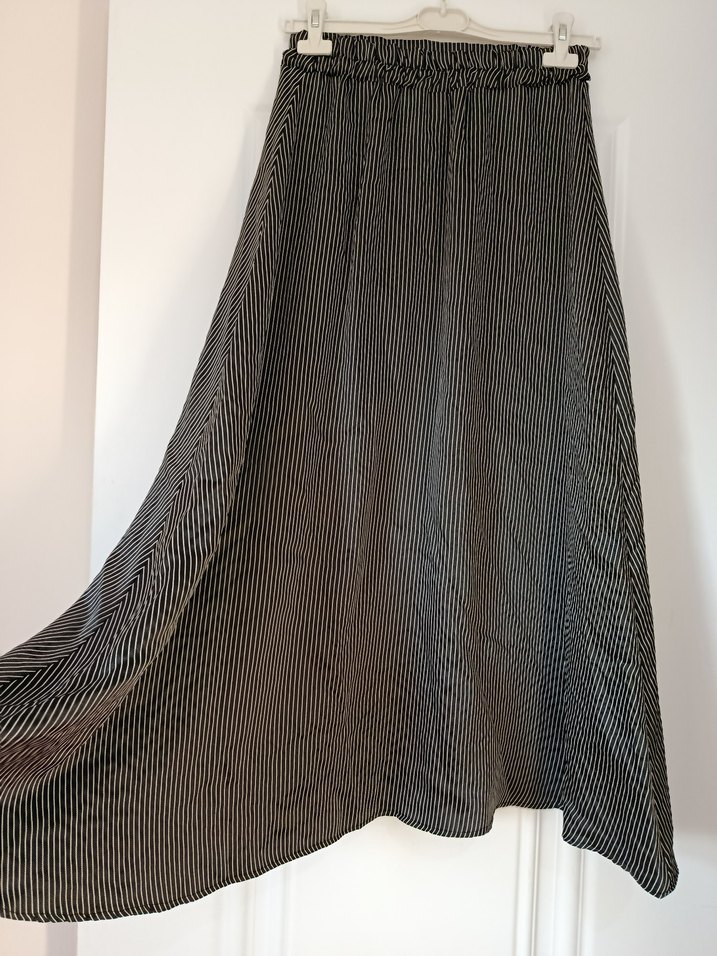 Siyah ve gri çizgili, pliseli, keten kumaştan uzun ve bol kesim etek. Günlük kullanım için modern Paris tarzı sunar.