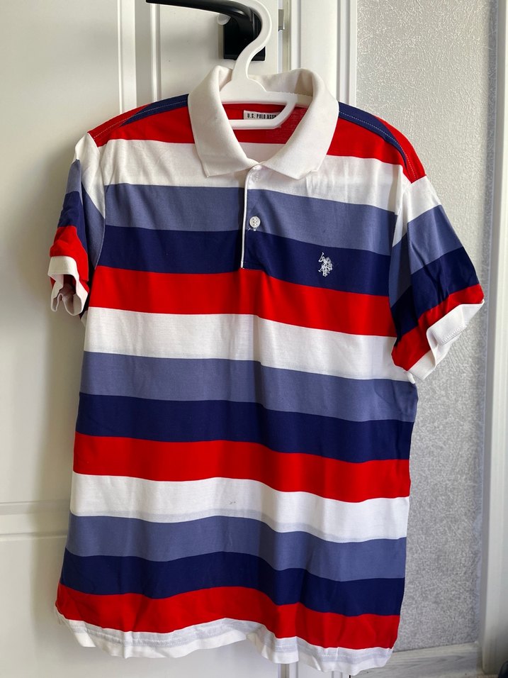 Çizgili, kısa kollu erkek polo tişörtü. Yaka düğmeli, vücuda oturan kesim ve hafif sentetik kumaştan, günlük kullanıma uygun.