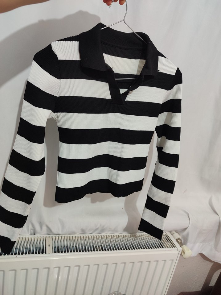 Dar kesim, uzun kollu kadın kazak. Polo yaka, kısa boy ve siyah-beyaz çizgili desenle sentetik yumuşak kumaştan üretilmiştir. Sokak stiline uygun.