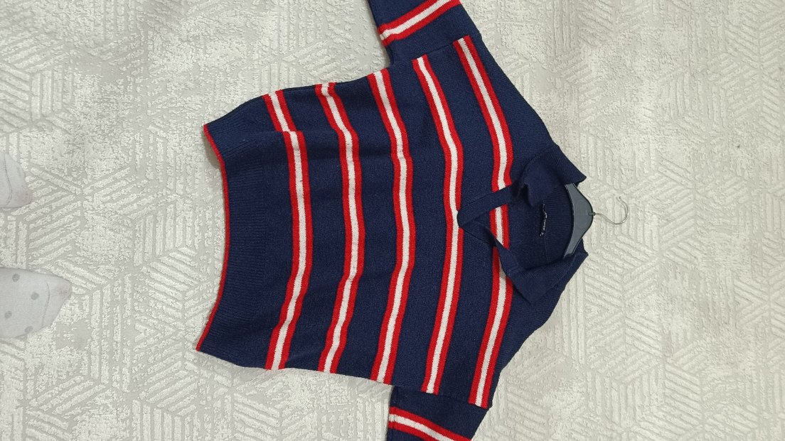 Çizgili desenli, polo yakalı, uzun kollu, triko dokuma kadın kazak. Günlük kullanıma uygun, rahat ve şık bir tasarım. s, m uyumludur