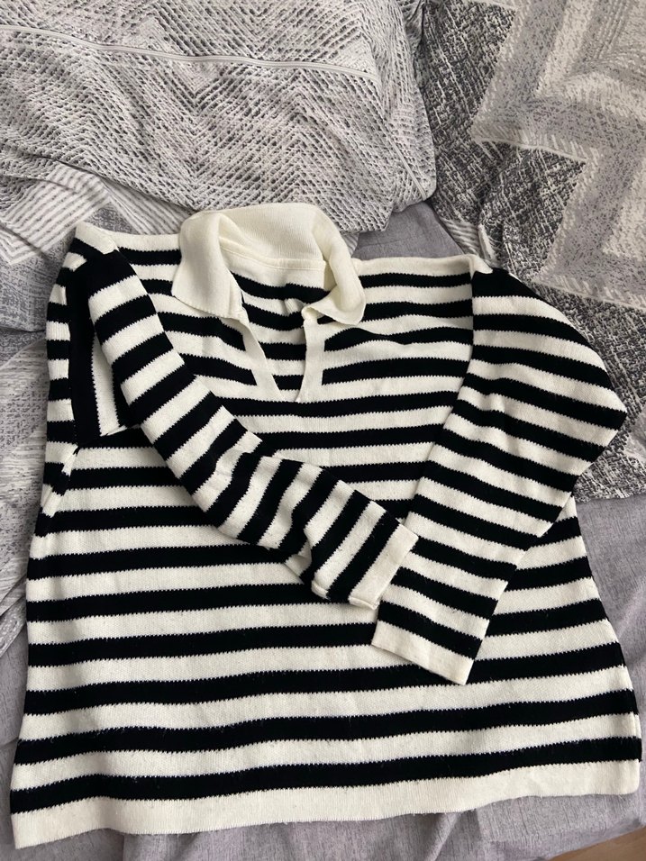 Fitted kesim, polo yaka ve uzun kollu kadın triko kazak. Siyah beyaz çizgili deseniyle günlük kullanıma uygun, trend bir sokak stili sunar. bir kere giydim