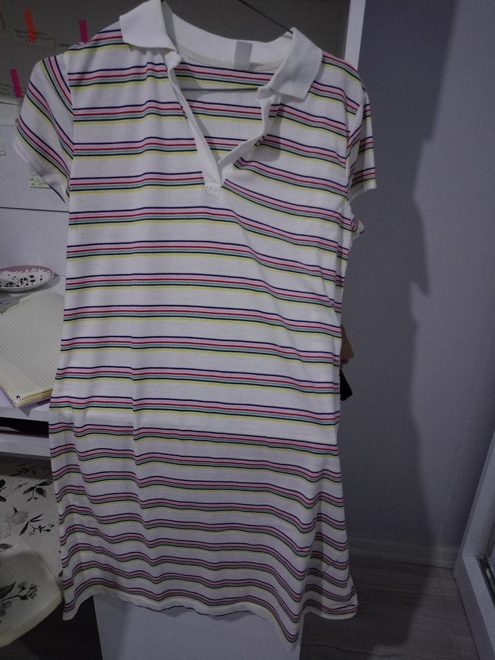 Kısa kollu, polo yakalı, çizgili elbise.Yaka kısmında sarı lekeler mevcut resimlerini ekledim bildiğinize. onun dısında sapaglam çok kaliteli.