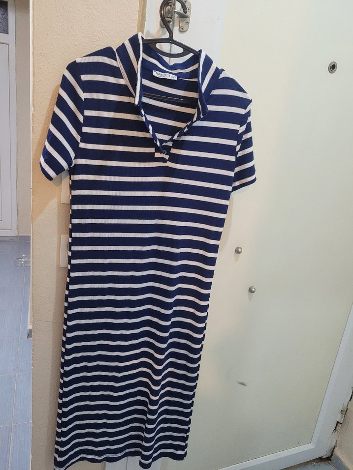 Çizgili, polo yakalı, kısa kollu, sentetik kumaştan yapılmış, pile detaylı ve vücuda oturan midi elbisedir. Lacivert ve gri renklerdedir.