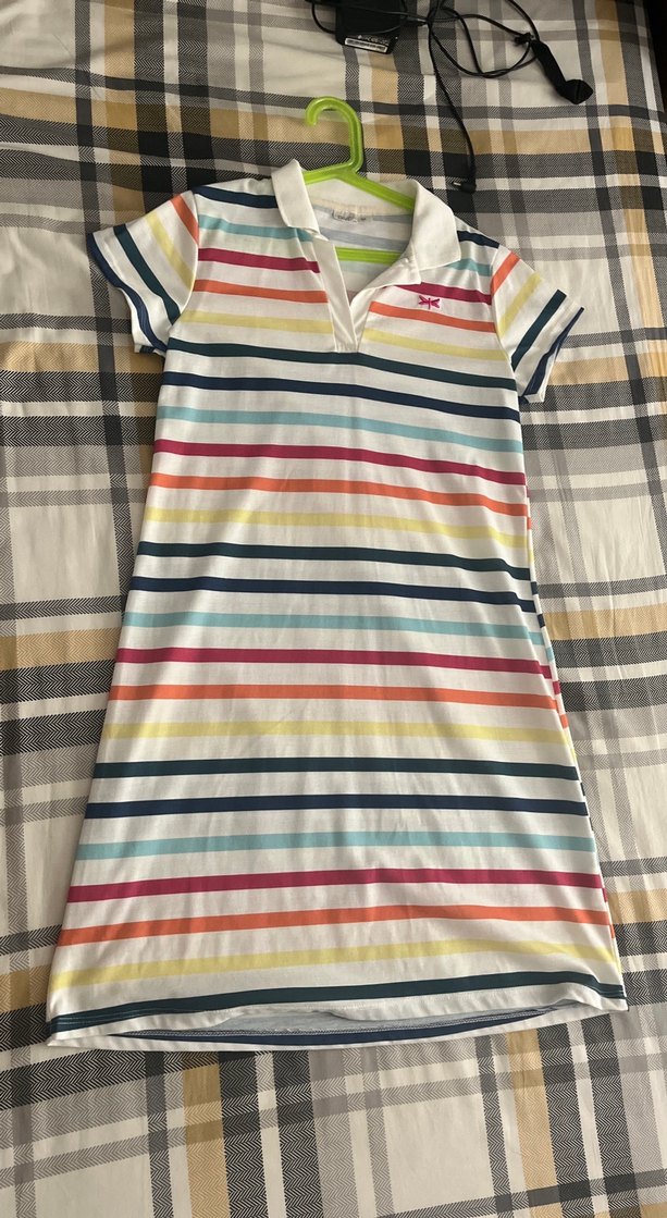 Renkli çizgili, kısa kollu, polo yaka midi elbise. Sentetik kumaştan, ince kesim ve düz detaylara sahip pratik bir gündelik kıyafet.