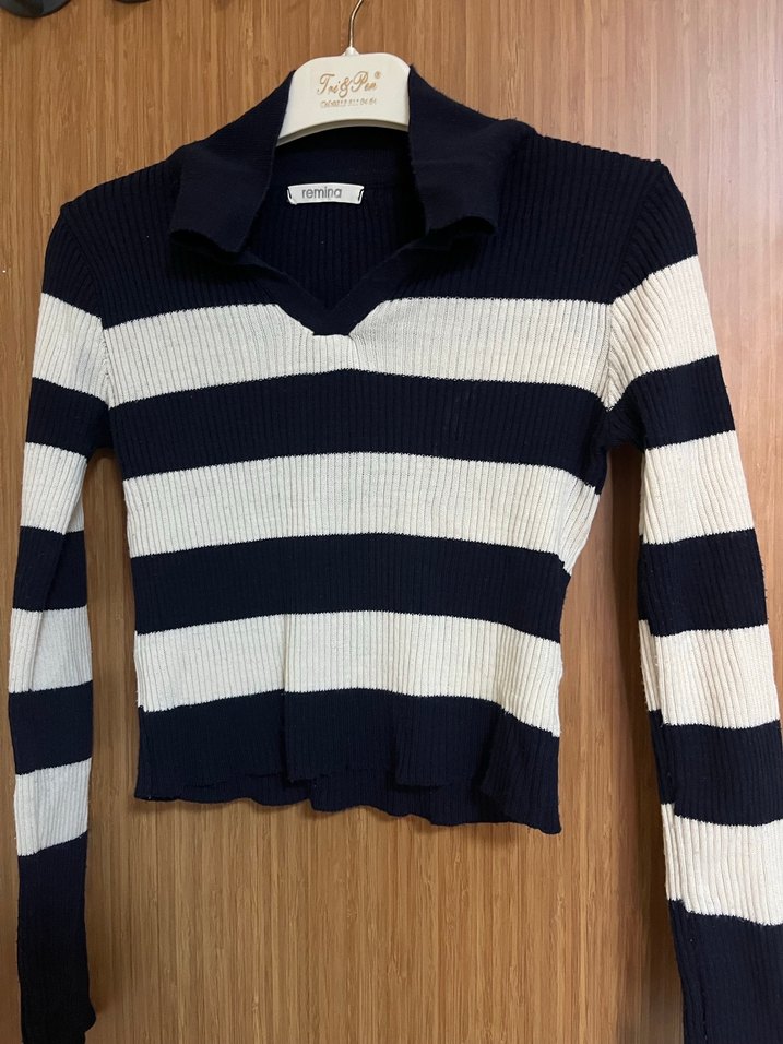 Çizgili Polo Yaka Triko Kadın Kazak