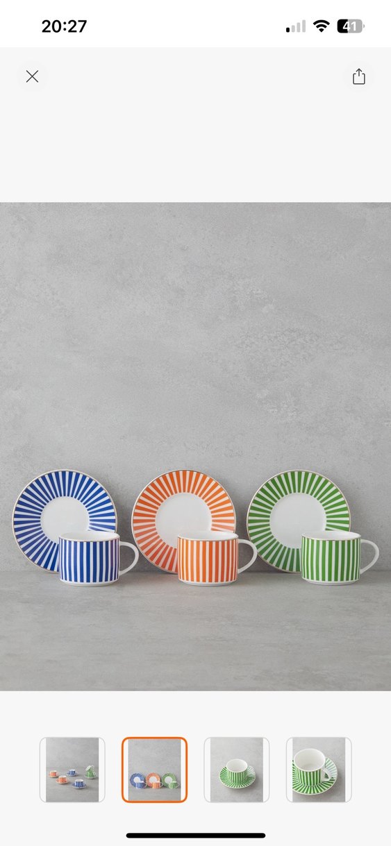 Mavi, turuncu ve yeşil çizgili desenlere sahip 3'lü fincan ve tabak seti. Her fincan kendi tabağıyla uyumlu çizgiler içerir. ☕