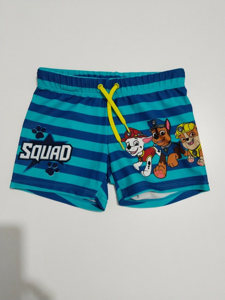 Renkli çizgiler ve 'SQUAD' yazılı baskılı desenleri olan erkek çocuk mayo şortu, ayarlanabilir sarı bağcık detayına sahiptir.