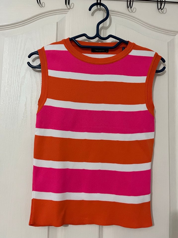 Kolsuz, fitted kesim ; turuncu, pembe ve beyaz çizgili, yuvarlak yakalı, örme sentetik kumaştan yapılmıştır. Trend sokak stili için uygundur.