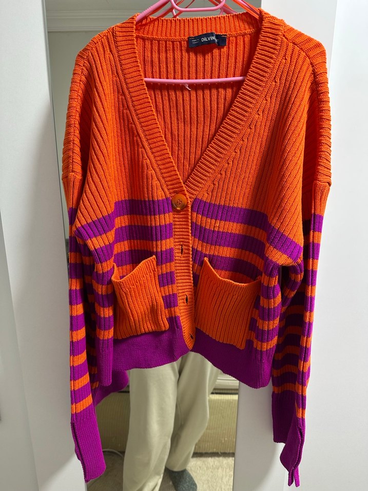 Renkli, çizgili örme hırka, bol kesim ve uzun kolludur. Midi boyda, yaka kısmı kesiklidir ve günlük sokak stiline uygundur. 2-3 kere giyildi
