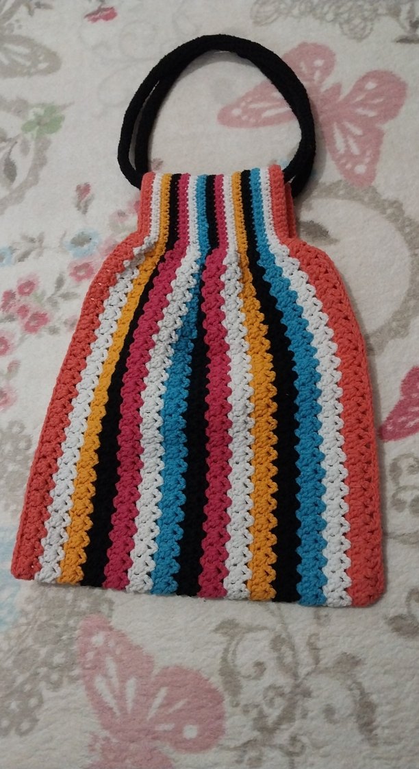Çizgili ve renkli örgü tasarıma sahip, siyah saplı ve küçük siyah püsküllü bohem tarzda kol çantası. sıfır ürün yeni örüldü.