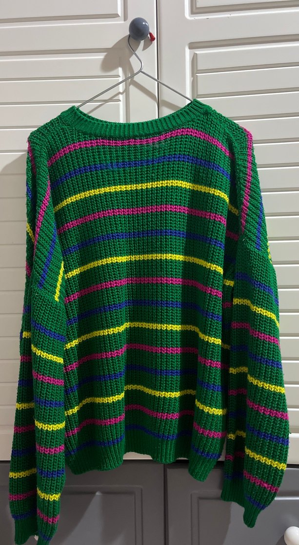 Çok renkli çizgili desenli, uzun kollu, yuvarlak yakalı kadın kazak. Yumuşak örgü kumaştan ve bol kesimdir. Rahat, bohem tarz için uygun.