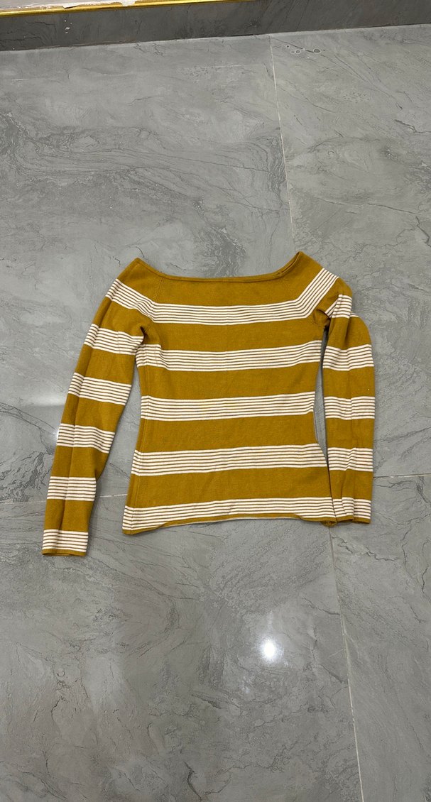 Bu kadın triko kazak, tekne yaka ve uzun kolludur. Yün örme kumaştan, sarı ve gri çizgili desende, midi boyda ve günlük kullanıma uygundur.