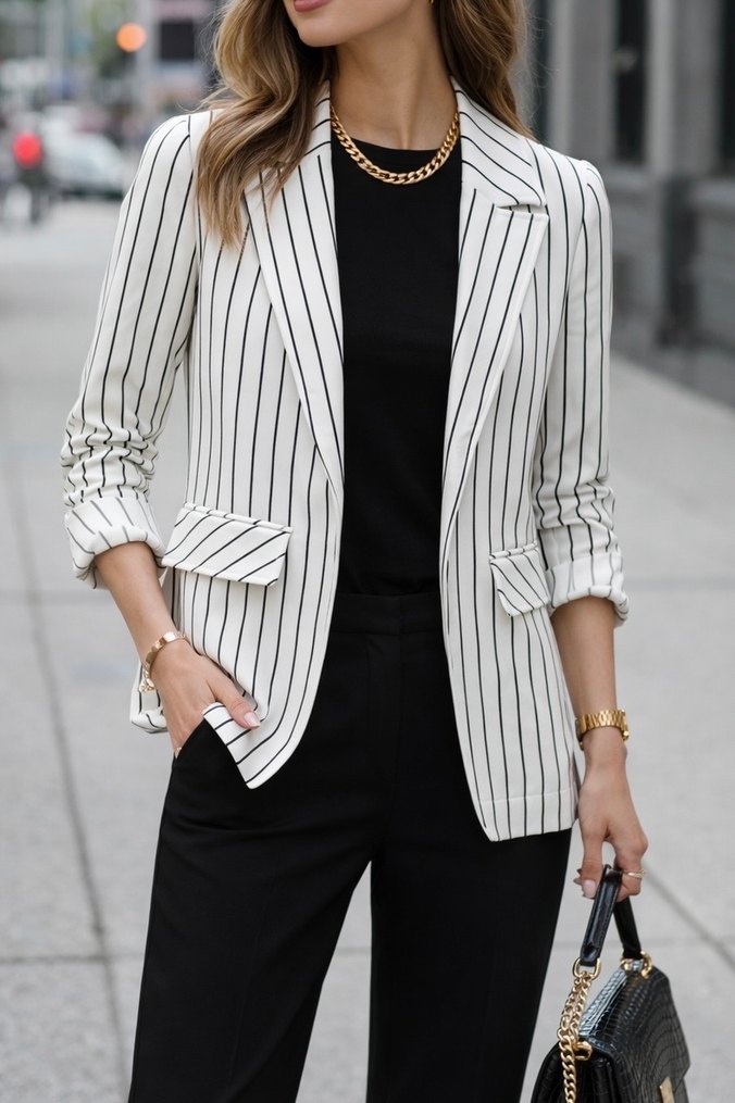 Beyaz zemin üzerine siyah çizgili, şık ve modern kesime sahip ceket/blazer. Hafif yapısı sayesinde hem günlük kombinlerde hem de ofis şıklığında rahatlıkla kullanılabilir. Kolları kıvrılabilir detaylıdır. #ceket #blazer #çizgiliceket #kadınceket #ofisstili #şık #minimal #gardrops #kombin #trend