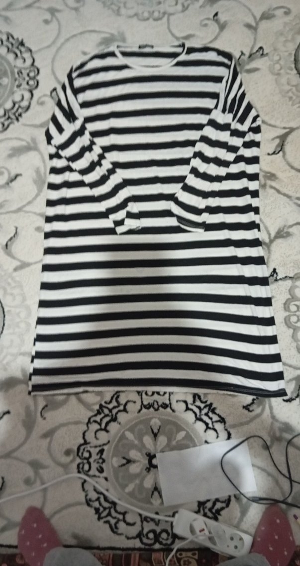 Siyah beyaz çizgili, uzun kollu, tekne yaka ve düğmeli, normal boyda hamile bluzu.