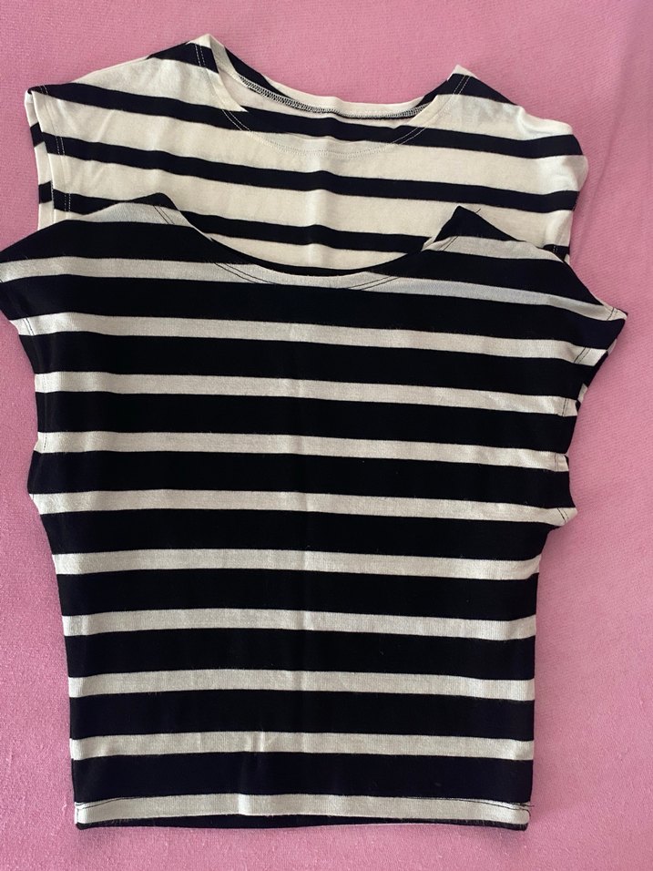 Tekne yaka, kısa kollu, çizgili ve pile detaylı siyah beyaz hamile tişörtleri. Yumuşak sentetik kumaştan, günlük kullanım için uygundur. İade yok