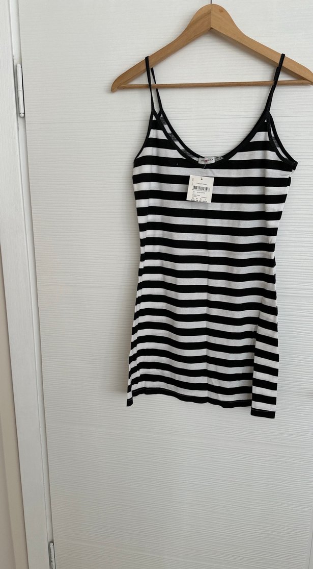 Siyah beyaz çizgili, ince askılı, tekne yaka ve vücuda oturan kadın atlet. Pürüzsüz sentetik kumaştan, gündelik rahat tarz için uygun.