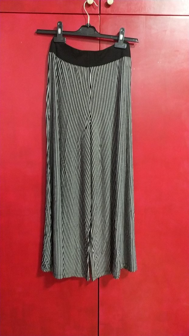 Kadınlar için uzun boy, bol kesim, çizgili siyah ve beyaz plaj pantolonu. Fazla kullanılmadı, hiç bir defosu yoktur.