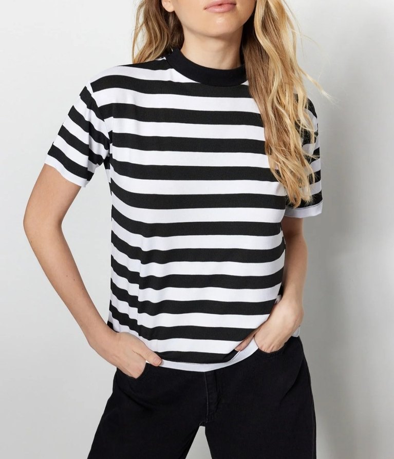 Siyah beyaz yatay çizgili, yuvarlak yakalı ve kısa kollu kadın tişörtü. Rahat kesim ve sentetik yumuşak kumaştan üretilmiştir. s ve m beden uyumlu