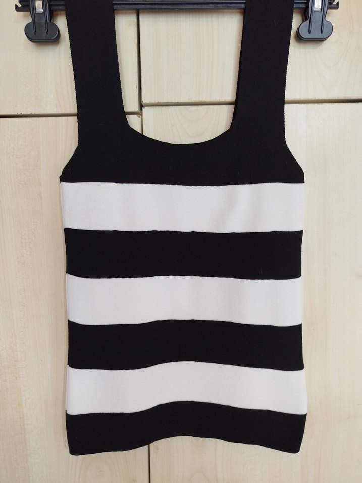 Kolsuz, tekne yaka, siyah beyaz çizgili, ince dokuma kumaştan, minimal sokak stili için uygun kadın atlet.