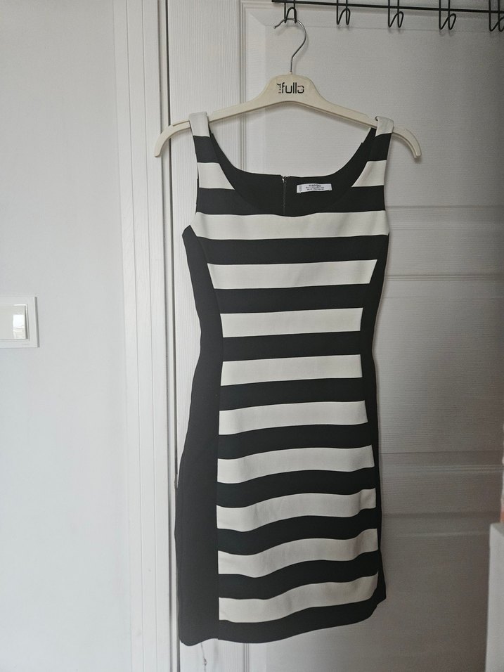 Çizgili, kolsuz, siyah-beyaz midi elbise, tekne yaka ve pile detaylı, yumuşak sentetik kumaştan, sokak stili için uygun.