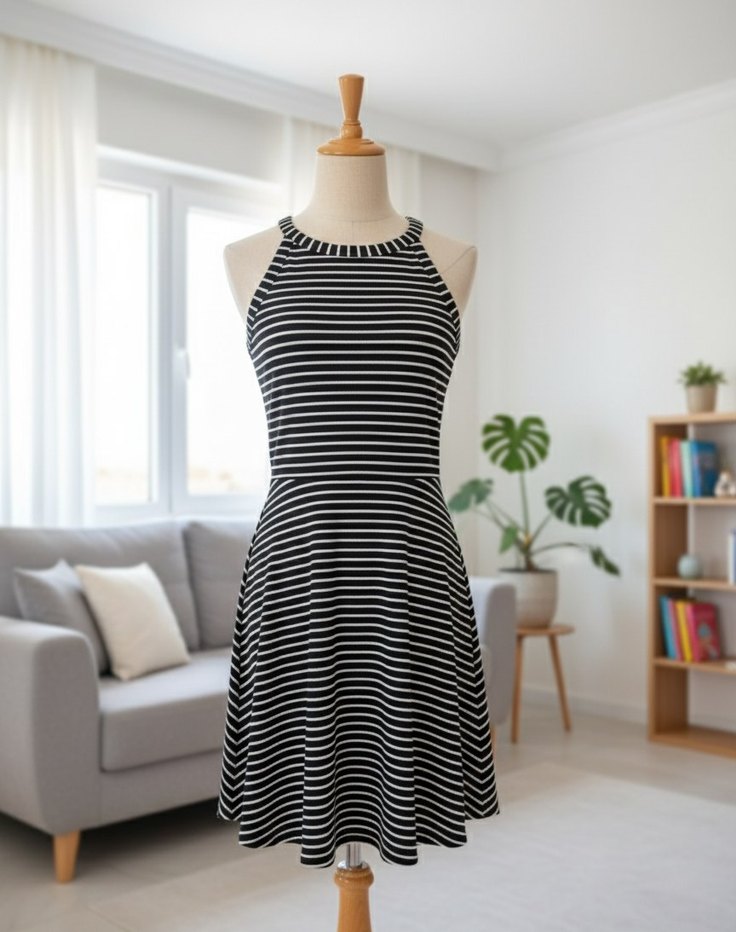 Çizgili Siyah-Beyaz Midi Elbise