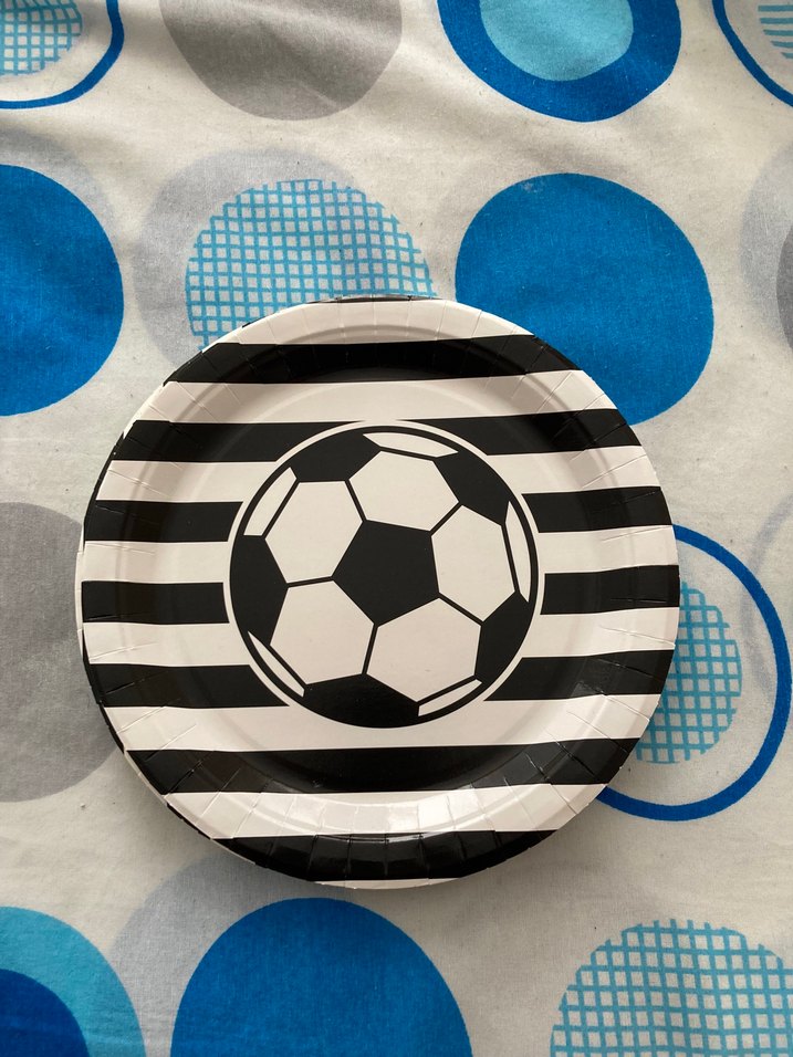 Çizgili siyah beyaz tabak, üzerinde futbol topu deseni bulunur ve renkli bir görünüme sahiptir. 7 adet mevcuttur. ⚽