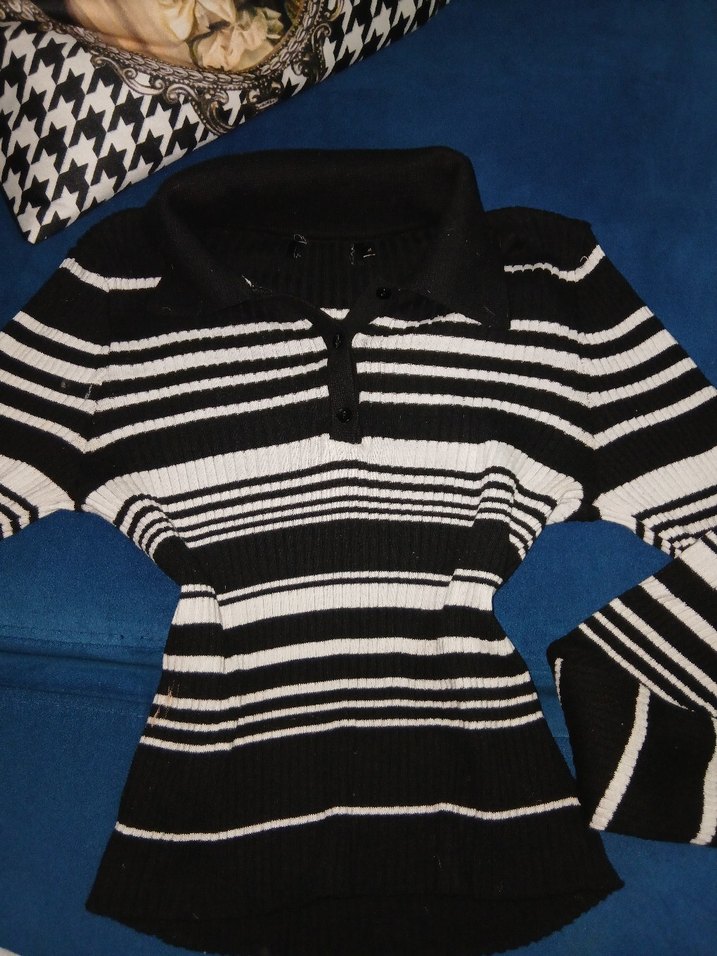 Dar kesim, uzun kollu, yakalı ve siyah beyaz çizgili triko kadın kazak. Normal midi boyda, rahat ve gündelik goth tarzına uygun bir parça.