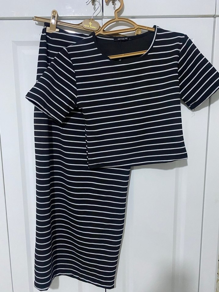 Kısa kollu, tekne yaka ve pilili detaylı, siyah beyaz çizgili, vücuda oturan etek üst. Günlük kullanım için uygun, sentetik kumaştan.