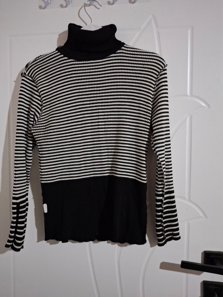 Boğazlı, uzun kollu, çizgili ve siyah-beyaz renklerde, yumuşak triko kumaştan yapılmış, vücuda oturan kadın kazağı. bir kolumda düğmeli eksik sadece