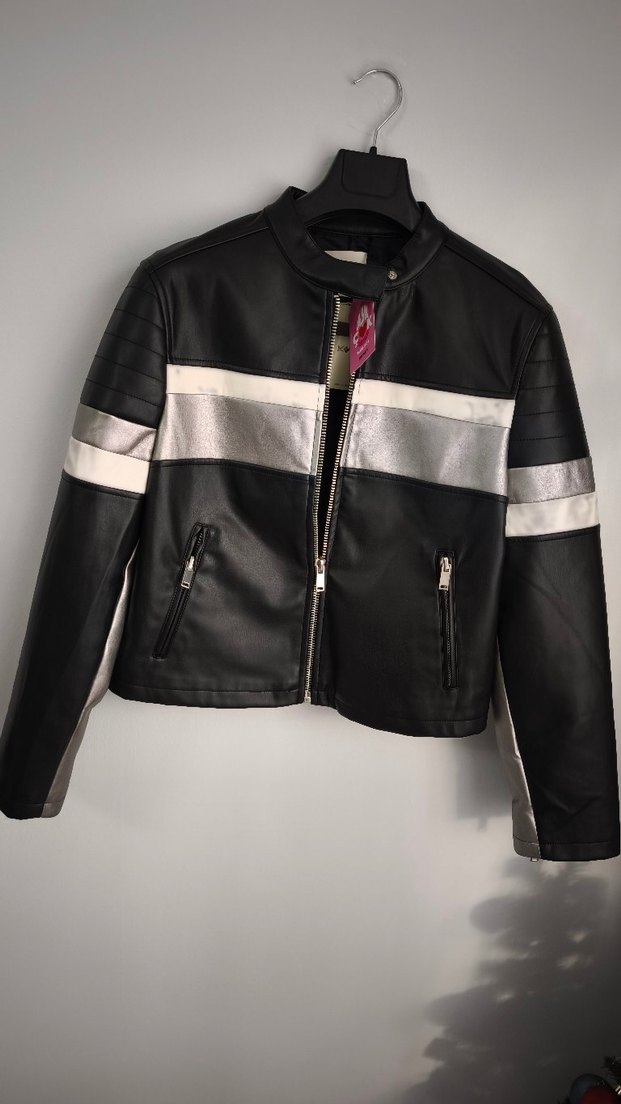 Fitted kesim siyah biker ceket, yaka kısmında kesik detay ve göğüs ile kollarda çizgili gümüş-gri bantlar bulunur. Kısa boy ve fermuarlı cepler içerir. ufak boya gibi defosu var beyaz yerlerde görsellere ekledim çıkarırım derseniz alın sıfır etiketli ürün hiçbir defosu yok başka