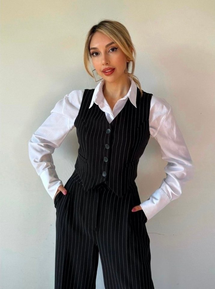 Düğmeli önü ve kesimli yakasıyla siyah çizgili, kolsuz kadın yelek. Ofis için uygun, sentetik kumaştan, rahat kesim ve şık görünüm sunar.