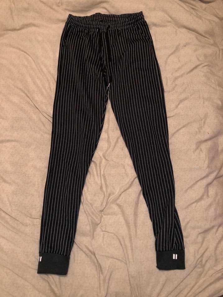 Sentetik kumaştan yapılmış, çizgili siyah kumaş pantolon, yan yırtmaçlı ve günlük rahat kullanıma uygun.