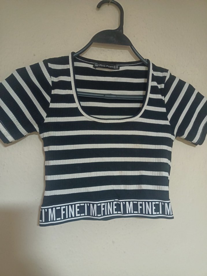 Tekne yaka, kısa kollu, çizgili ve triko dokulu bu crop top, esnek sentetik kumaştan, altında "I'M FINE" yazılı bantlıdır.